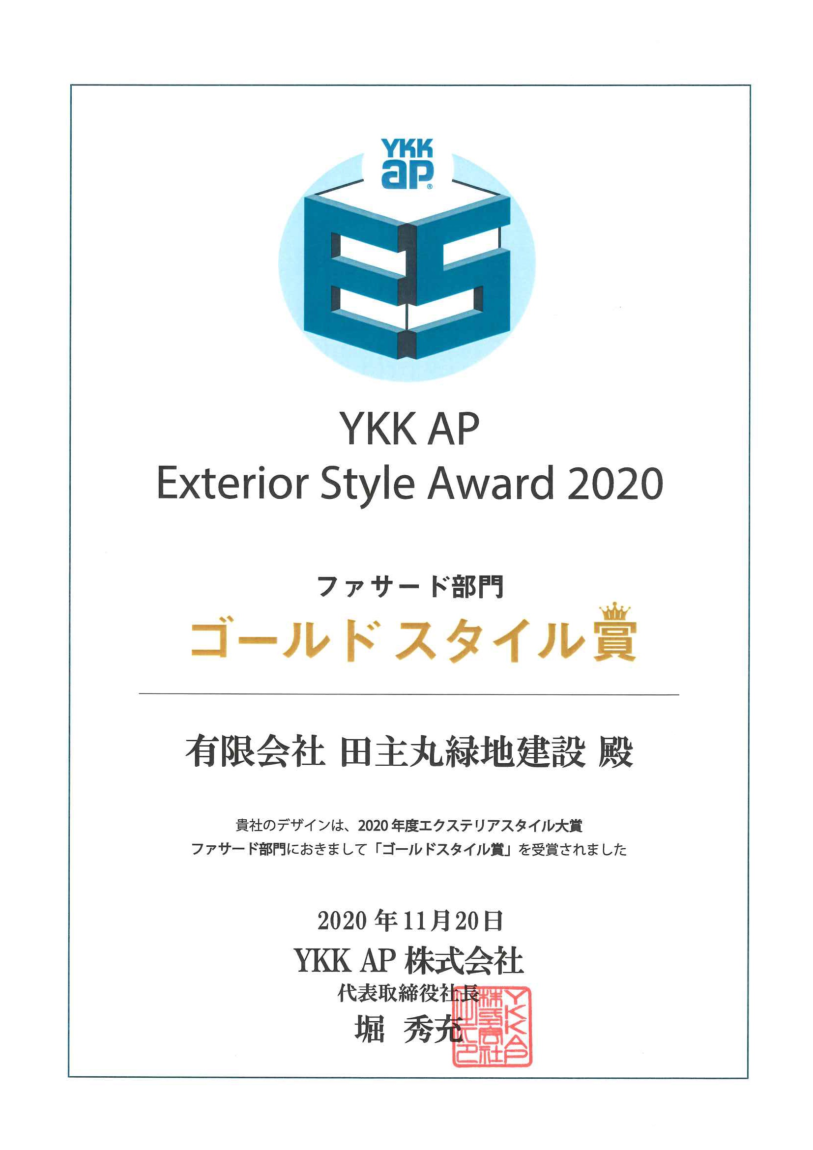 YKK AP エクステリアスタイル大賞 ファサード部門においてゴールドスタイル賞を受賞